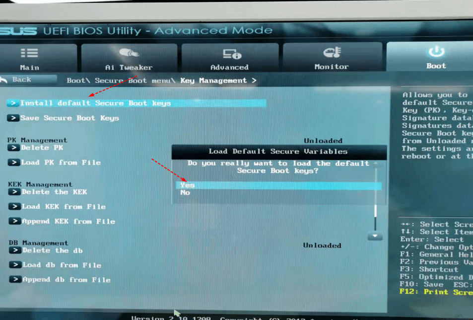 Step 3. Click the “Install default Secure Boot Keys” option. Now the Secure Boot is enabled.
