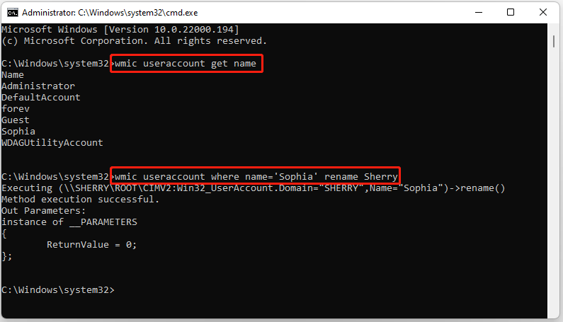 Step 4. Type "wmic useraccount where name='Sophia' rename Sherry". (Replace "Sophia" with your old account name; Replace "Sherry" with your new account name.) Then press "Enter" to execute the command.