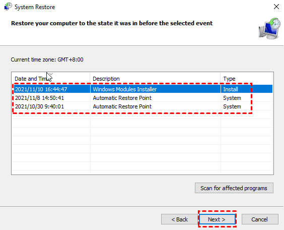 Step 6. Select a restoration point that will restore Windows 11 to a time before the DPC_Watchdog_Violation issue occurs on your machine. Alternatively, simply choose the most recent restore point date available.