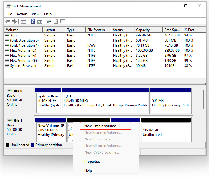 Step 4. Right-click the newly created unallocated space next to the resized volume and select "New Simple Volume".