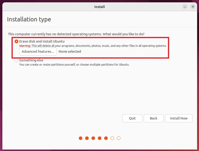 Step 5. Select your language preference and continue until you come across the "Erase disk and Install Ubuntu" option. Click "Install Now".