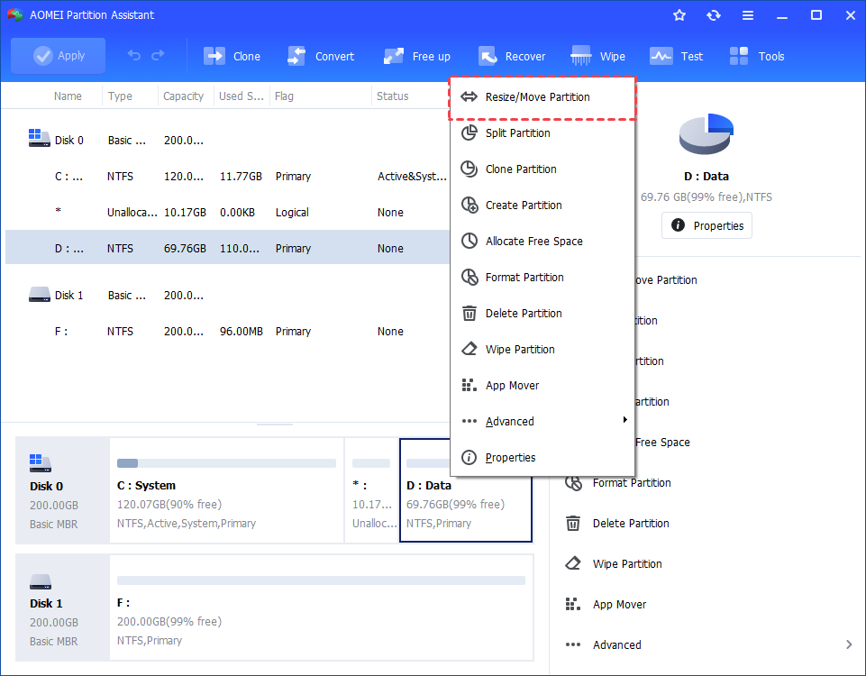 Step 1. Install and launch AOMEI Partition Assistant. Right-click the target partition (for example, D:) in the main console and select "Resize/Move Partition".