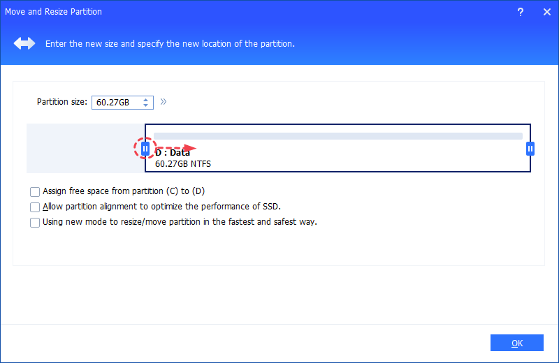 Step 2. Resize the partition and drag the partition border left or right to shrink the partition. Click "OK" to generate unallocated space.