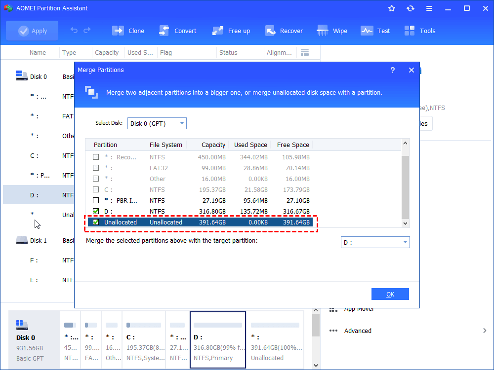 Right-click the partition you want to enlarge, choose "Advanced" > "Merge Partitions".