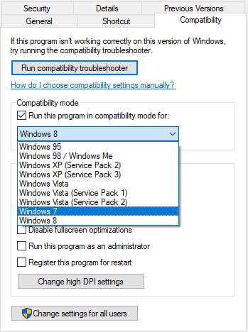 Step 2. Go to the "Compatibility" tab, check "Run this program in compatibility mode for," and choose "Windows 7".
