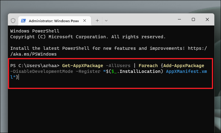 Step 2. Type or copy+paste the following command and press Enter: Get-AppXPackage -AllUsers | Foreach {Add-AppxPackage -DisableDevelopmentMode -Register “$($_.InstallLocation) AppXManifest.xml"}