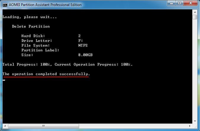 2. Type: partassist.exe /del:F and press Enter. That means deleting F drive. Alternatively, you can type: partassist.exe /hd:0 /del:0 to delete partition 0 on disk 0.
