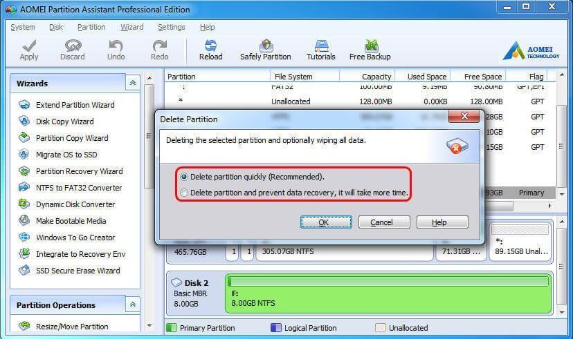 AOMEI Partition Assistant Professional is all-around partition manager that allows you to delete a partition thoroughly in simple steps. It is a tiny program with no bundled software. Command line operations supported as well. It works on Windows 7, 8, 10, XP, Vista. Let’s take a closer look.