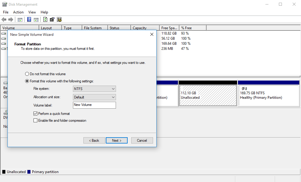Step 5: Enter the amount of memory you wish to allocate for your new partition and click on the Next button. To store data on this partition, you must format it first. Click on the Format this volume with the following settings: