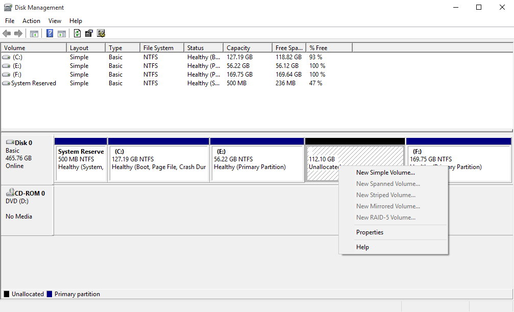 Step 4: You should now see a new unallocated space in your Disk Management window. Right-click on the unallocated space and select the New Simple Volume option. The New Simple Volume Wizard should pop up. Click on the Next button to continue.