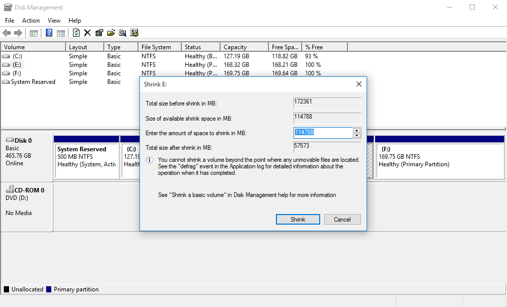 Note: You cannot shrink your volume more than the amount indicated in the Size of available shrink space in MB section.