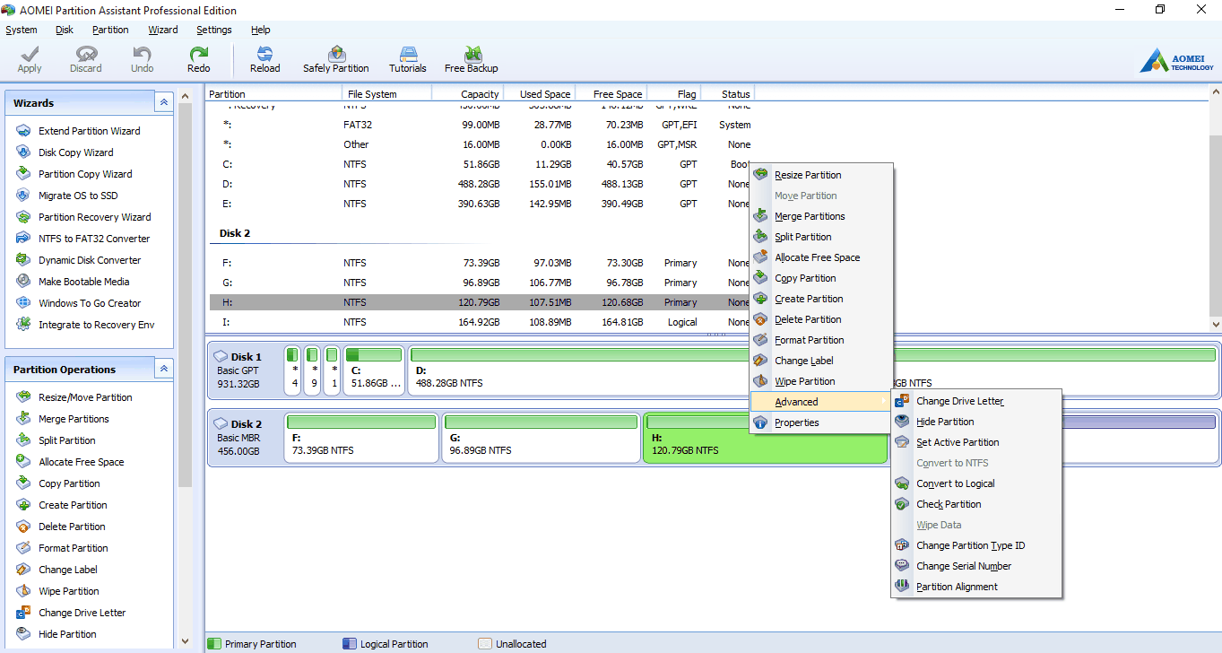 step1. Right-click the primary partition which you want to convert and go to “Advanced” and select “Convert to Logical Partition”. Click “OK” to confirm the operation in the following pop-up window. Commit the operation by clicking “Apply” on the tool bar.