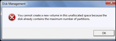 Once 3 primary partitions and 1 extended partition are created, if you want to create a new volume, you will receive this error message: You cannot create a new volume in this unallocated space because the disk already contains the maximum number of partitions.