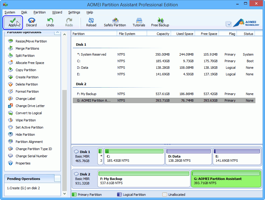 At last, you can preview the new partition, and then click "Apply" on the toolbar to save the operation.