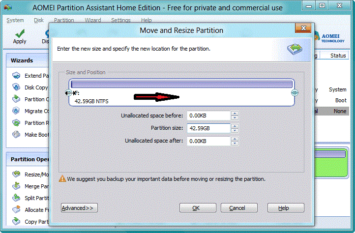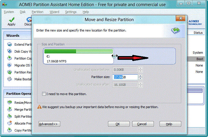 Tip: If you drag the handle from right leftwards, the unallocated space will be behind F partition and not right behind C partition. Then, you have to first move F partition to put it after the unallocated space and make unallocated space before F and right after C. Then, you can extend partition Windows 8.