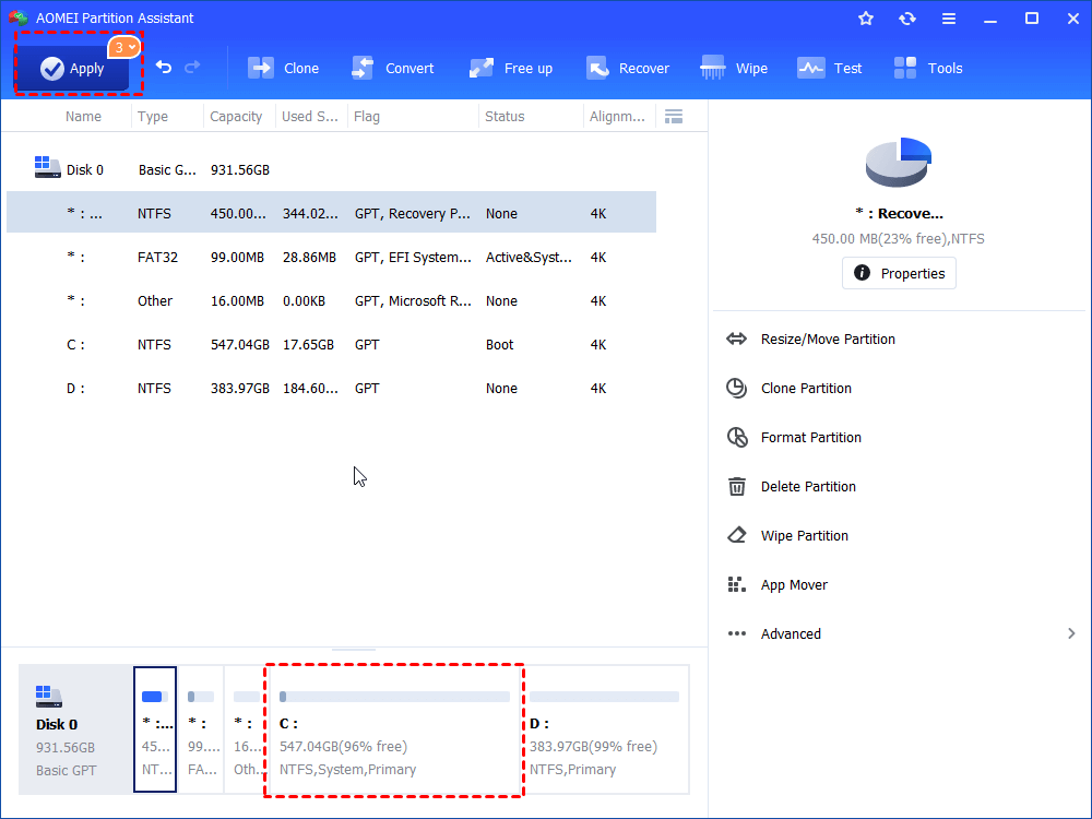 Step 3. Click "OK". You can see C drive has been extended. Please click "Apply" to commit the operations.